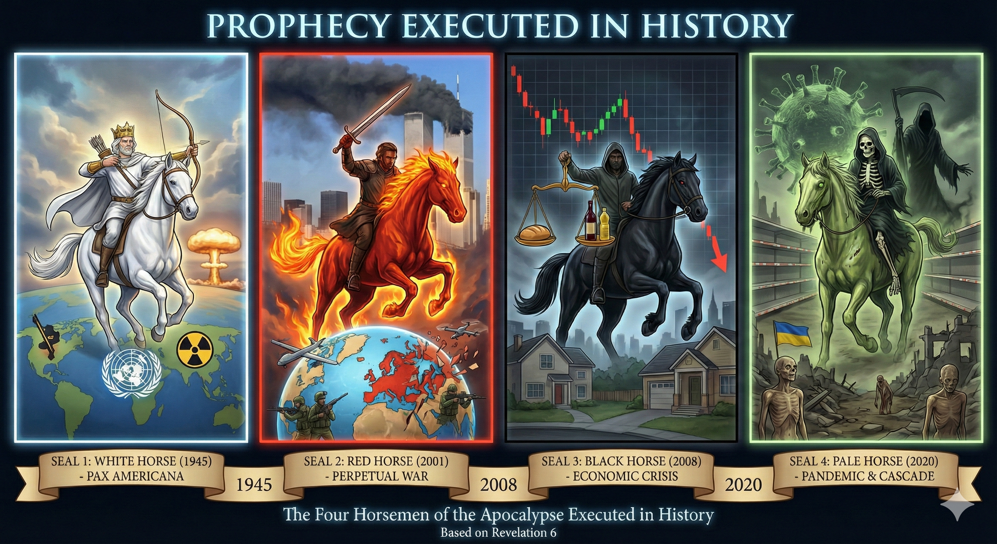 The diamond does not exist in isolation. It sits within a broader prophetic framework that has been executing in observable history since 1945. The seven seals of Revelation 6 describe a sequence of global developments that would characterize the end of the age. The first four seals—the Four Horsemen—have opened in precise chronological order. These are not interpretations. They are documented history.